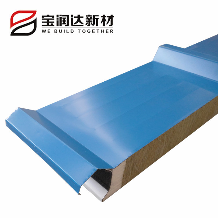 巖棉夾芯板選用憎水巖棉,憎水率大于98%。隱藏式暗釘搭接方式,獨特的防水槽設計,有效防止雨水滲透,防止螺釘生銹,延長屋面板使用年限。 |